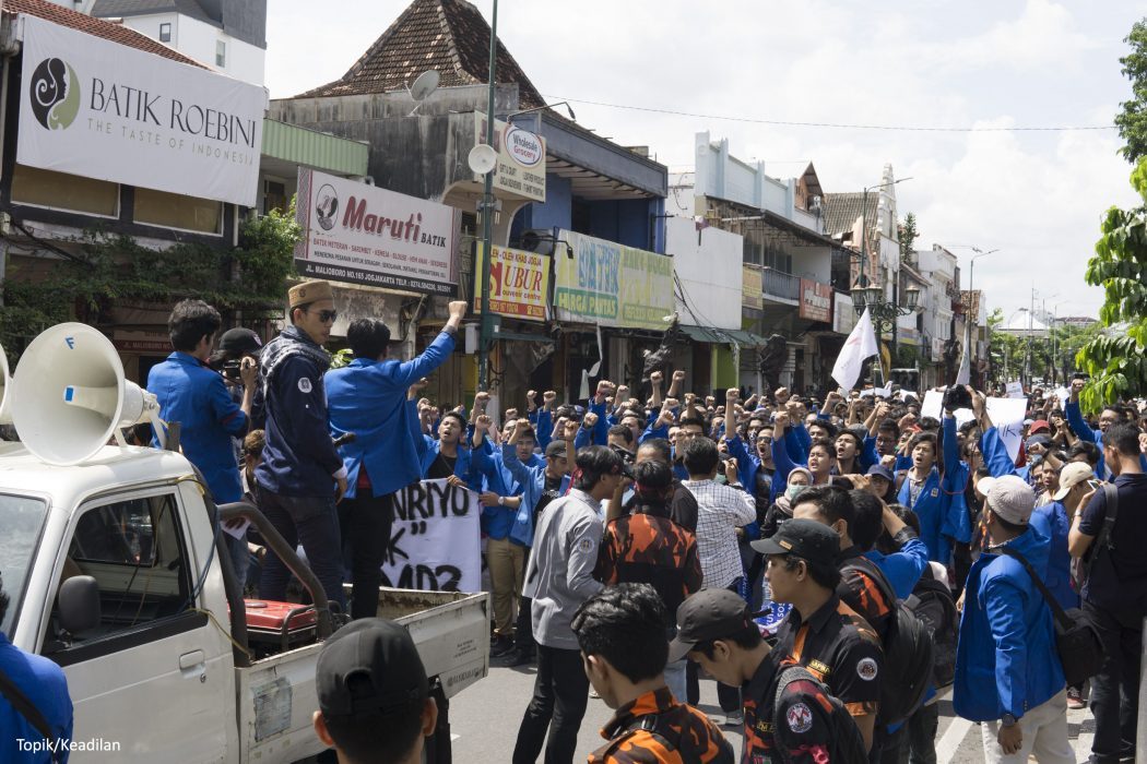 Aksi yang diikuti lebih 70 organisasi itu dimulai pada pukul 13.00, dengan titik kumpul di taman parkir Abu Bakar Ali. Pengarahan dilakukan oleh setiap koordinator, agar aksi bisa berjalan dengan lancar. Perjalanan dimulai dengan menuju Gedung Dewan Perwakilan Rakyat Daerah (DPRD), Provinsi Yogyakarta. Setelah berjalan kurang lebih 500 meter dari titik kumpul, tiap perwakilan organisasi menyuarakan aspirasinya, untuk membakar semangat dalam melawan ketidakadilan.