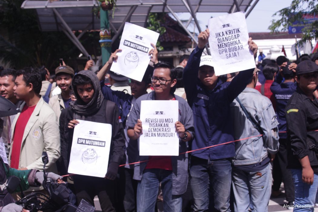Para demonstran telah memasuki sebagian halaman Kantor DPRD Provinsi Yogyakarta, dengan pengawalan ketat dari kepolisian. Masa yang menunggu untuk masuk ke halaman kantor, tetap mengaspirasikan tuntutannya. “DPR mutungan, Revisi MD3 disahkan, demokrasi jalan mundur!, Jika kritik dianggap menghina, DPR bubar saja, Tangkap kami DPR, penuhi penjara dengan lautan mahasiswa, ada yang memplesetkan pengertian DPR menjadi Dewan Pengkhianat Rakyat”. Begitulah slogan-slogan dalam spanduk yang merepresentasikan kekesalan mereka kepada wakil rakyat.