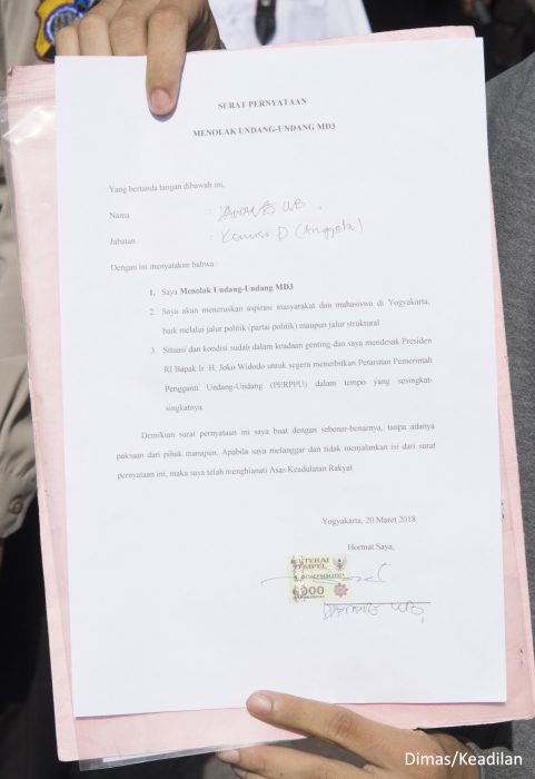Akhirnya, seluruh demonstran bisa memasuki halaman Kantor DPRD. Mereka meminta agar dapat bertemu dengan wakil rakyat, agar aspirasinya dapat didengar. Pertemuan itu berbuah hasil, dengan dilakukannya penandatanganan oleh Danang WB, Anggota Komisi D. Di depan para demonstran dia membacakan surat pernyataan penolakan terhadap revisi UU MD3. Dalam surat itu menyatakan bahwa dia menolak revisi UU MD3, dengan meneruskan aspirasi masyarakat dan mahasiswa Yogyakarta, baik melalui jalur politik maupun jalur struktural.